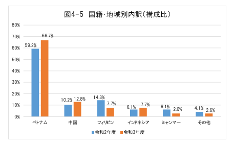 出典:厚生労働省 令和3年度外国人技能実習機構業務統計 概要/国籍・地域別内訳(構成比)(P21)