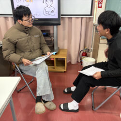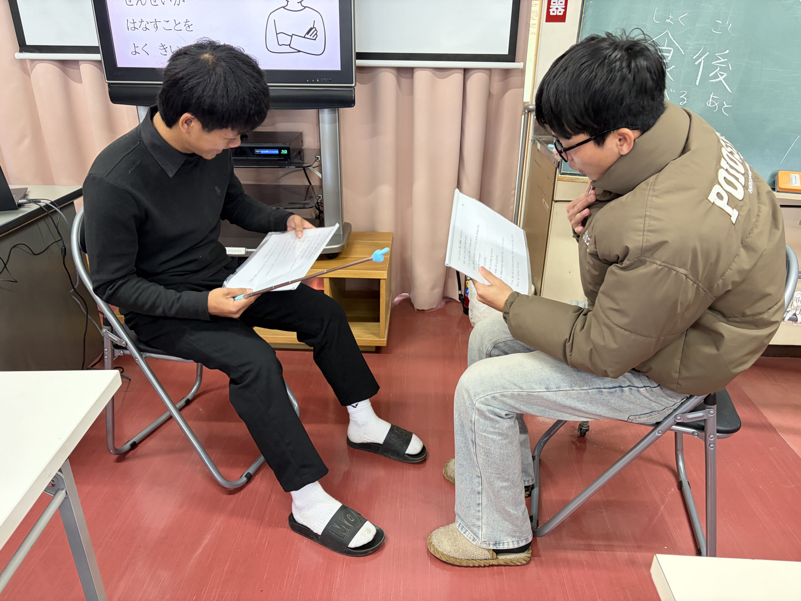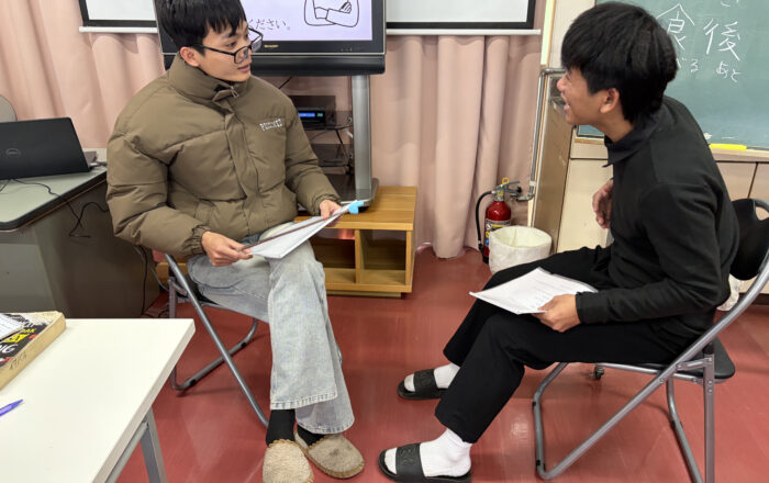 写真では、ベトナム出身の2人が、体調不良という設定で会話をしています。午前中の文法の授業で学んだ時制の表現を取り入れて発話できており、きちんと考えながら文法知識を実践している姿が見られました。
