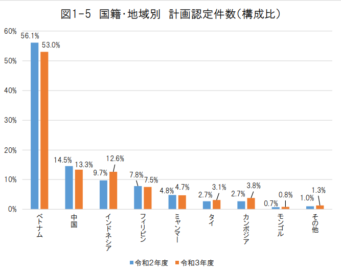 出典:厚生労働省「令和3年度外国人技能実習機構業務統計 概要」P4 国籍・地域別 計画認定件数(構成比)
