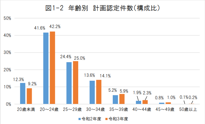 出典:厚生労働省「令和3年度外国人技能実習機構業務統計 概要」P2 年齢別 計画認定件数(構成比)
