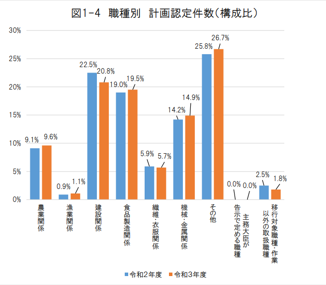 また、近年では介護業界など(その他項目内)で活躍する技能実習生も増えつつあります。