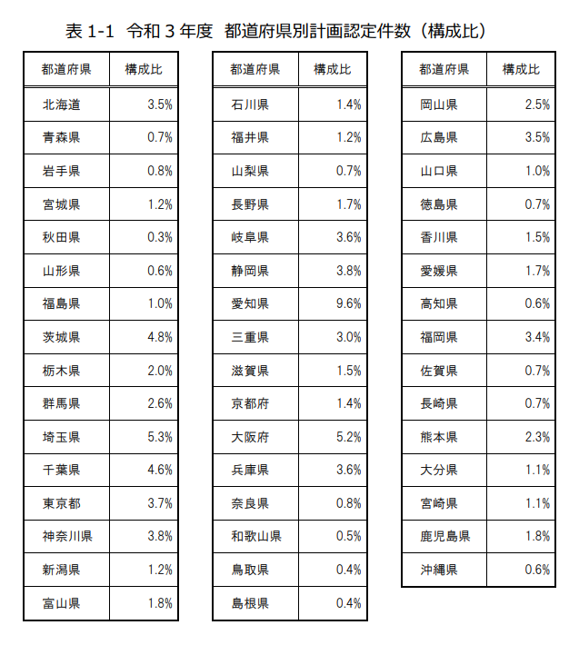 出典:厚生労働省「令和3年度外国人技能実習機構業務統計 概要」P8 令和 3 年度 都道府県別計画認定件数(構成比)